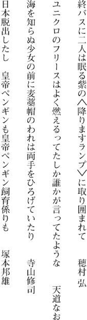 このプログラムは歌人の穂村弘による公開レクチャーである。23歳のときに林あまりの短歌に出会った事で一首の歌の持つ力を知り、以来気鋭の歌人として歌集はもちろん、詩集、エッセイ等も精力的に執筆している。映像を喚起させる歌の多いためか、画家やイラストレーターとのコラボレーションも多い。 今回のレクチャーでは、短歌と映像を出会わせてみたいと思う。穂村弘による短歌作品の紹介と解説と共に、呼応するようにセレクトされた実験映像作品の上映を行う。導入は、寺山修司から。俳句、短歌、散文詩、芝居、映画、評論と表現の(問いの?)フィールドを拡大していった彼の作品から始まって、90年代の短歌と実験映画のつかむイメージを追いながら個々の作品が持つ時代の空気を感じることが出来ればと思う。言葉と映像の表現で何が共通していて何が違うのか。寺山修司の時代と弱冷・抗菌の時代で何が変わっていったのだろう。(澤隆志) 若い頃の寺山修司のエピソードをきいたことがある。 三島由紀夫脚本の芝居を観に行った寺山が、休憩時間になったとたんにすっくと立ち上がって「もう三島も終わりだな、これからは寺山の時代だ」と叫んだということだった。いったいどういう性格なんだ、と思って驚く。休憩時間ってことは、まだ後半があるだろう。せめて最後まで観てから云えよ、と思うのだが、改めて考えてみると、それは単に性格の問題というだけではなく、その背後には、今の人間にはよくわからない時代の空気感のようなものがあったのではないか。 『家出のすすめ』を書いて、実際に家を出てきてしまった若者たちを次々に自分の劇団に受け容れる、などということが当時はできたのだ。今だったら犯罪扱いされてしまうだろう。 また寺山は一般市民を巻き込んだ市街劇、ハプニング劇を盛んに行っていたが、現在では、演出上、まっくらな闇が欲しいと思って会場の非常灯を消そうとするだけで一苦労になるらしい。 そのかわり(?)我々には弱冷房車や抗菌便器が与えられている。弱冷房車や抗菌便器の意味を理解できるのは、ごく限られた時代と空間を生きている人間だけだろう。 そして、二一世紀には板前さんが素手でお寿司を握ることが禁止されるのではないだろうか。抗菌手袋をして握ることが義務づけられるのだ。いや、それでも完全とは云えない。いちばんいいのは、抗菌エサだけで大きくした抗菌マグロを開発することだ。マグロ自体が抗菌ならもう大丈夫。私たちは安心してトロが食べられるのである。(穂村弘) 穂村弘●1962年札幌生まれ。歌人。歌集に『シンジケート』(沖積舎、90)『ドライ ドライ アイス』(沖積舎、92)『手紙魔まみ 夏の引越し(うさぎ連れ)』(小学館、01)等。短歌(反)入門書『短歌という爆弾』(小学館、00)やエッセイ『世界音痴』(小学館、02)、詩集『求愛瞳孔反射』(新潮社、02)がある。 また、 短編集『いじわるな天使から聞いた不思議な話』(大和書房、94)や訳書に『ちずのえほん』(フレーベル館、96)など。 |