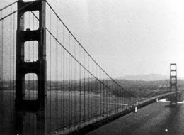 遠くを見れない男●作者のピーター・ローズは、アメリカ実験映画におけるポスト構造主義を代表する映像作家。この作家の特質は、コンセプトはきわめて硬質であるにもかかわらず題材の基本はパーソナルな体験をよりどころにしていること。映像がきわめてリリカルでしかも壮大なスケールで捉えていることなど、これまでの実験映画にはない数多くの要素を取り入れていることだ。クライマックスといえる最終章(5部構成)では、作者が一人、サンフランシスコの金門橋をカメラを持って登る。この孤独な撮影パフォーマンスが、彼の肩に固定されたカメラが写し出す風景によって、観客に寂寞とした共感をもたらす。金門橋を吊す巨大なケーブルと、米粒のようにカメラを持ってたたずんでいる作者と、その向こうの無限に拡がる空間が、作者のパーソナルな体験を超越して、私たちにミクロとマクロが混在した不思議な世界観を与えてくれる。なお、プロローグにおける「むかしむかし、遠くを見れない男がいた」という詩は、実はクゥアモンテスという架空の詩人が、どこの国の言葉でもない”言語”で詠んだもの。また、作中に流れるSKIES OF AMERICA はオーネット・コールマンの楽曲。