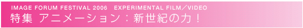 特集「アニメーション:新世紀の力!」は2 プログラム11 作品で構成されています。1906 年4 月のアニメーション映画誕生(J.S. ブラックトン『愉快な百面相』)100 年を記念して製作された『TOKYO LOOP』は、日本のアニメーション作家、美術家、イラストレーター、漫画家16 名が参加した全く新しいオムニバス・アニメーション作品です。他に、ブラザーズ・クエイやティム・マクミラン、ラン・レイク等、実験的アニメーションで世界をリードする作家を輩出するイギリスから、博覧強記とフェティッシュな魅力に富んだ最新アニメーション作品を上映します。