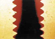 5分/白黒/1958/79年改訂 ●題名は現代物理学でエネルギー分子を指すが、視覚的には未開社会の芸術を思わす。黒味フィルムへのスクラッチ。 |