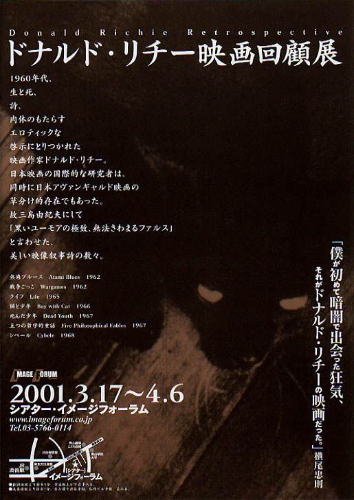 シアター・イメージフォーラムでは昨年2000年11月に開催した「マヤ ・デレン映画回顧展」に引き続き、「アヴァンギャルド・クラシックス」第2弾として3月17日より「ドナルド・リチー映画回顧展」を開催いたします。また、連動企画としてイメージフォーラム・シネマテークで「ドナルド・リチー映画回顧展 Part2」を開催いたします。