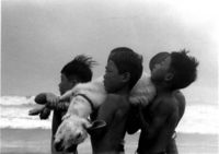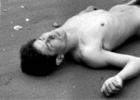 | 脚本、監督、編集=ドナルド・リチー/1962年/16ミリ/モノクロ/22分 ●14人の少年と一匹の山羊による、死をテーマにした寓話的な物語。白い山羊をめぐって海辺に集まった半裸の少年達。死の儀式は残酷にも仲間と共存することの難しさを露呈する。波で洗われる山羊の屍を観て、自分の孤独が掘り起こされるのを黙視するとり残された少年。誰の少年期にも起りうる出来事が、とてつもない緊張感によって凝縮され、新たな記憶として創造される。台風で撮影が中断するというアクシデントに見舞われながらも撮影を続行、荒れた海が画面に驚異的なダイナミズムを与えている。荒れる海にかぶせる音響効果の創作に多くの時間を費やした。舞踏家土方巽の協力のもとに千葉県の海辺の村で撮影された。クノックル・ル・ズート、メルボルン映画祭で受賞 |