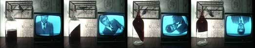 | 私の窓 My Window/Mein Fenster オーストリア/1979年/2分30秒/35mm/カラー 1979年オーバーハウゼン映画祭(ドイツ)受賞 ◎ニュースを伝えるテレビとワイン瓶とかごの中のオウム。テレビの中の画面がゆっくり回転し、静止しているはずのボトルとかごの中もゆっくりと傾き始める。 |
