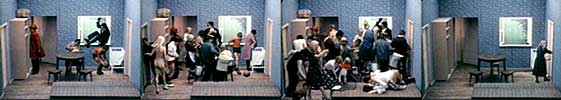 | ニュー・ブック New Book/Nowa Ksiazka ポーランド/1975年/12分30秒/35mm/カラー 1976年オーバーハウゼン映画祭(ドイツ)大賞受賞、1976年メルボン映画祭(オーストラリア)受賞 ◎一つの画面が9つに分けられ、その中で「ミクロな物語」が展開される。タイトルは、それぞれのキャラクターが一つの箱から別の箱へと移る様子が本が持ち手を変えるのに似ていることからつけられた。 |