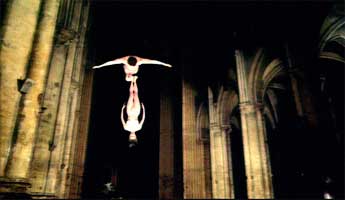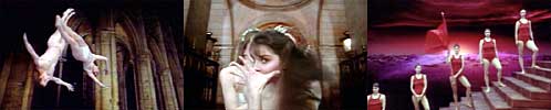 収 録 作 品 オーケストラ The ORCHESTRA ◎「『オーケストラ』を作るために、私はアメリカからフランスに3トンもの高解像度撮影の道具とシンプルなモーション ・コントロール・カメラの本体を運んだ。私は様々な場所を撮影した。その内の一つがシャルトル大聖堂だ。シャルトル大聖堂は物凄く大きく、建物の中はとても暗い。私は約250キロワットの光を上向きに当てたが、それでも光は天井には届かなかった。そして、建物の中の残りの場所は闇に沈んでいた。床に描かれたマンダラ模様をあらわにするために、私はすべてのイスを動かさねばならなかった。全部で数千脚、少なくとも数百脚はあったに違いない。天井からは5メートル間隔で、きたない白いランプがつり下げられていて、照明をたけば、すべてが丸見えになってしまう。ひどいものだった。午前2時に、誰かの手に油を塗って、ランプに手の届くところによじ登って、外してみようとした。しかも、そこにあったスピーカーや宗教上の教えの書かれた板も、壁にくっついていて離れないことがわかった。そこでしかたなく、私は床に座り、私が15歳でグダンスクにいたときに頭の中に見えた空飛ぶカップルを「撮影」してみようと思った。」ズビグ・リプチンスキー ◎『オーケストラ』は、戯曲作家が古典のテキストを舞台化するように、有名な6つの曲を、ズビグが映像化したものである。モーツァルトの「ピアノ・コンチェルト21番」:非常に美しい庭に集まった夜会服を着た老年の男女が人生の喜びを(再び?)味わっている。ショパンの「葬送行進曲」:永遠に続く鍵盤の前で、人々が行進曲のうちの一音だけを奏でる。(略)アルピノーニの「アダージョ」では空中に吊り下げられた二つの壇の上に、モーニング姿の男がいる。男は彼を落下の危険にさらす罠や誘惑をくぐり抜けて前へ進む道を見いださなければならない。ロッシーニの「泥棒かささぎ」:ルーブル美術館のギャラリーで軽騎兵の大軍とバレリーナのグループに囲まれたオーケストラのディレクターが、ヒゲを剃り、服を着替える。シューベルトの『アヴェ・マリア』:シャルトル大聖堂の夜の正面玄関。花嫁と花婿は一緒に来るのではなく、服を脱いだ途端、浮遊する。ラヴェルの『ボレロ』:若いコムソモール(全連邦レーニン共産主義青年同盟)の運動選手、ブルーカラーの労働者、農夫、探偵が、終わりのない階段を上り続けている。その階段は共産主義の栄光をたたえる勇壮な夕日の上にかかっているが、最後に彼らは、黙示録的で避けることのできない混とんにたどりつく。 ◎選び出された音楽のシーンはそれぞれに関係があるわけではない。しかし、リプチンスキーの映像では、いきいきした大勢の出演者の、よどみない循環によってそれぞれのシーンが関係づけられている。人物と彼らの衣装は階級、性、老いについての強迫的な考えを反映している。恒久で、流行を意識した装いは生、欲、死の寓話に富んでいる。画像のパンや、映像の遊びは自らをぼかすようで、創意に富んでいると同時に過度に取り澄ましている。しかしリプチンスキーのシュールレアリズムには落ち着いたエレガントさと、思慮深さと楽しさ両方の感覚がある。 ◎『オーケストラ』は資本主義に辛辣で、それは常にセックス・食べ物・死のイメージを通して描写されている。また美術館や大聖堂の中にあるすべてのアート、すべてのハイ・カルチャーは死を追い求め、カニバリズム的であると暗に示している。音楽もよい。(「ニューヨーク・マガジン」1990年4月23日号) 地層のようなものとして扱っている。地質学者がそれぞれの地層に取り組み、分析するように、彼にとっては、すべての線が別々のシステムになる。そのずれとバロック的な要素は映像の幾何学性よりもむしろ純粋に地層学の産物である。そしてこの事は、私の意見では非常にオリジナルな物である。彼はもはやプロットではなく、横向きのラインを使った遊びをしているのであり、それはまるで音楽家が楽譜を使って、音楽のなかをすべらせていくかのようだ。(略)ドゥルーズはこれを気に入るだろう、これは「襞」だ(略)そう、この中には本当に「襞」があるのだ!(ポール・ヴィリリオ/1989年)